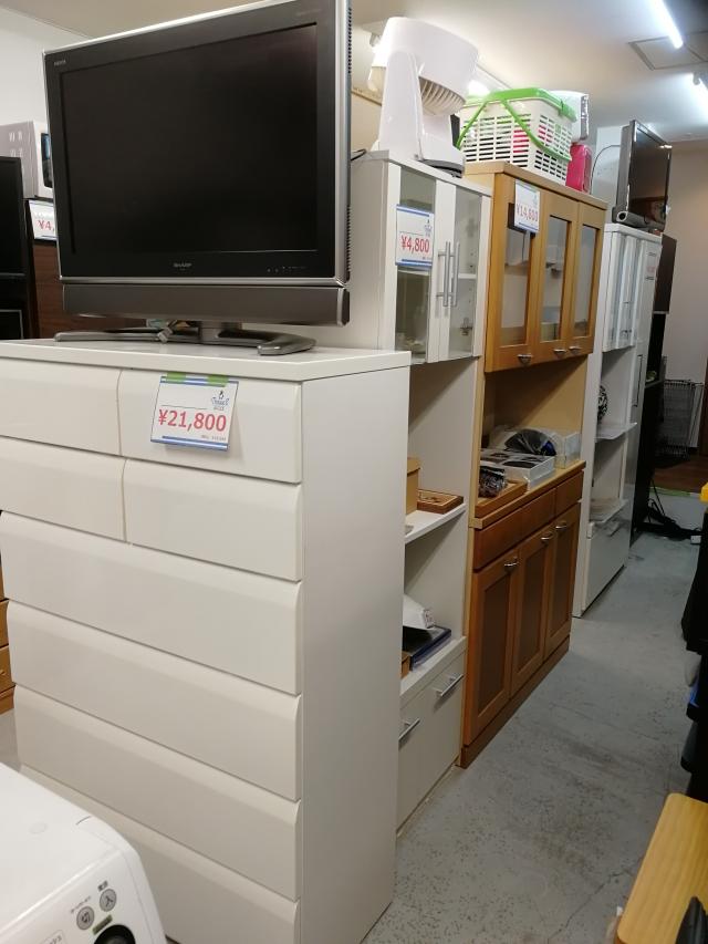 スリーエスでは、冷蔵庫や洗濯機などの家電以外も充実しております☆ タンスや食器棚、写真には載せきれないほどの商品があります^^ リサイクル品といえど、きれいな商品ばかりです☆